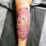 Tetování z filmů a pohádek, portrét a postavička Harley Quinn na lýtku