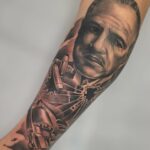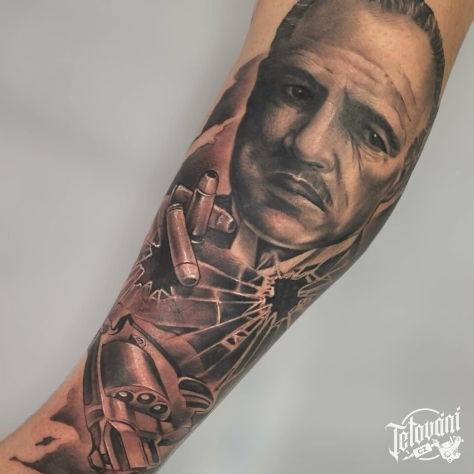 Tetování z filmů a pohádek, portrét a znaky a symboly, zbraň na předloktí