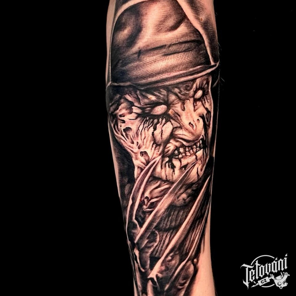 Tetování z filmů a pohádek, portrét Fredy Krueger na předloktí