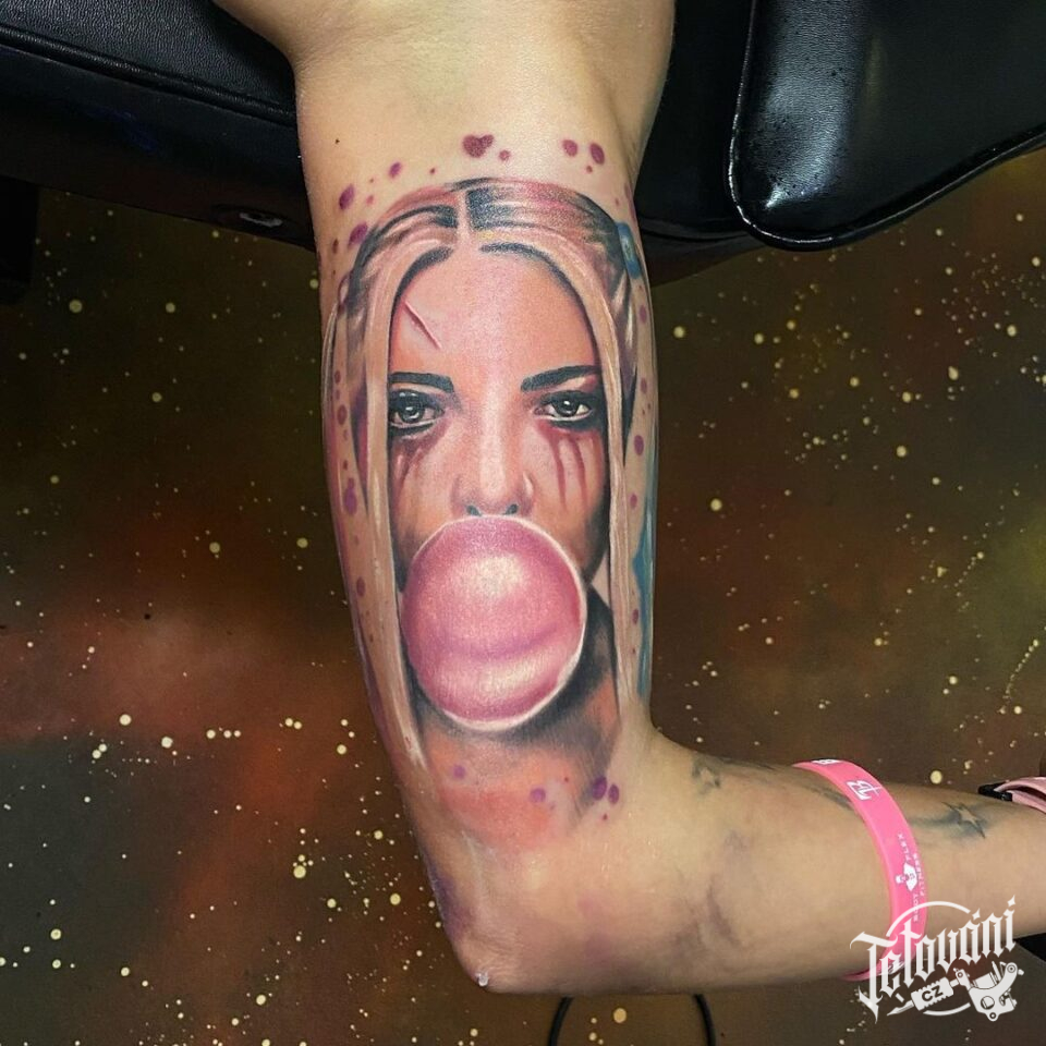 Tetování z filmů a pohádek, portrét Harley Guinn na paži