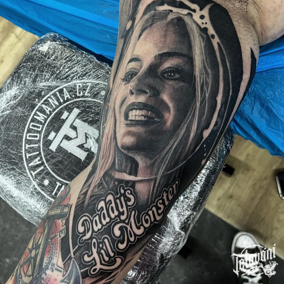 Tetování z filmů a pohádek, portrét Harley Quinn na paži