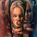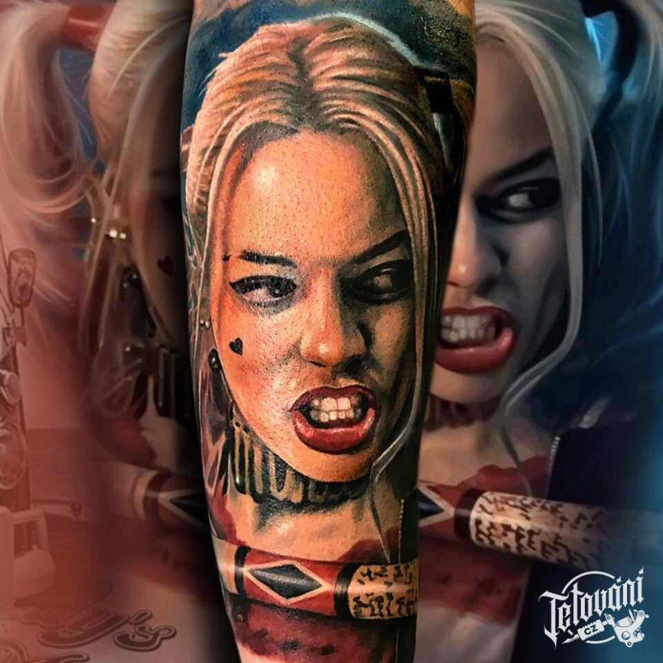 Tetování z filmů a pohádek portrét Harley Quinn na předloktí