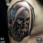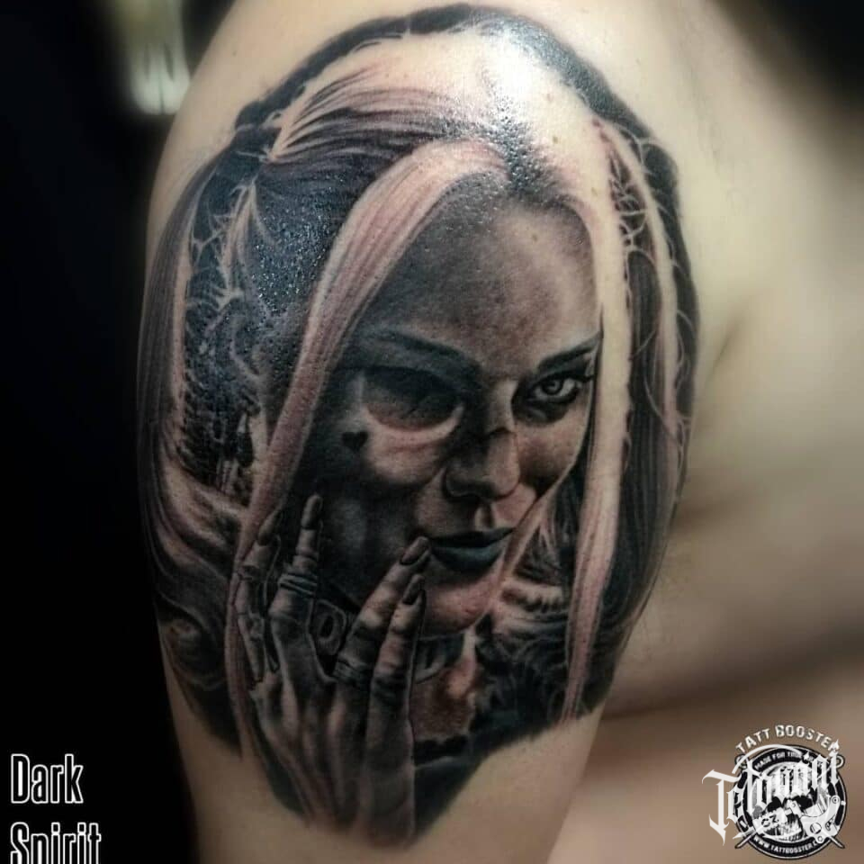 Tetování z filmů a pohádek, portrét Harley Quinn na rameni