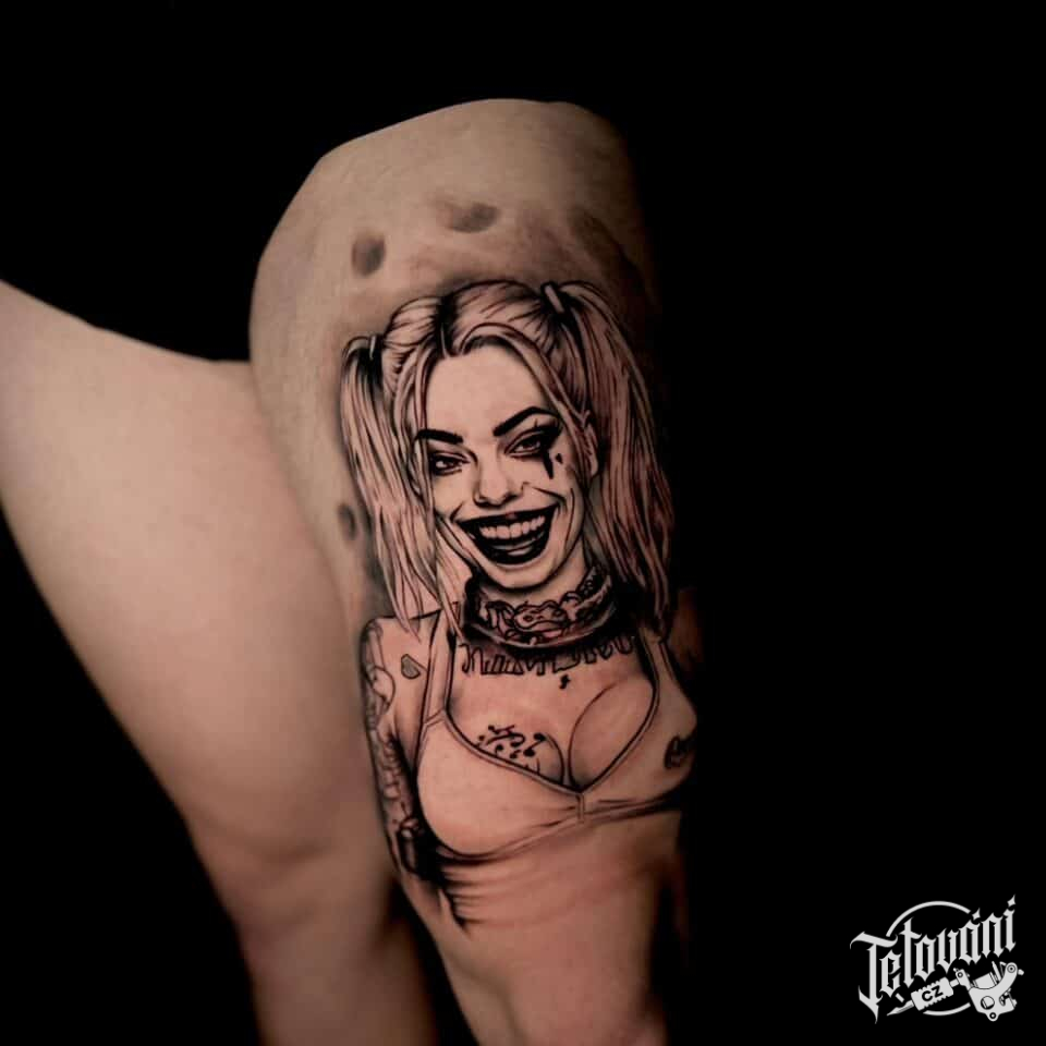 Tetování z filmů a pohádek, portrét, Harley Quinn na stehně