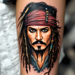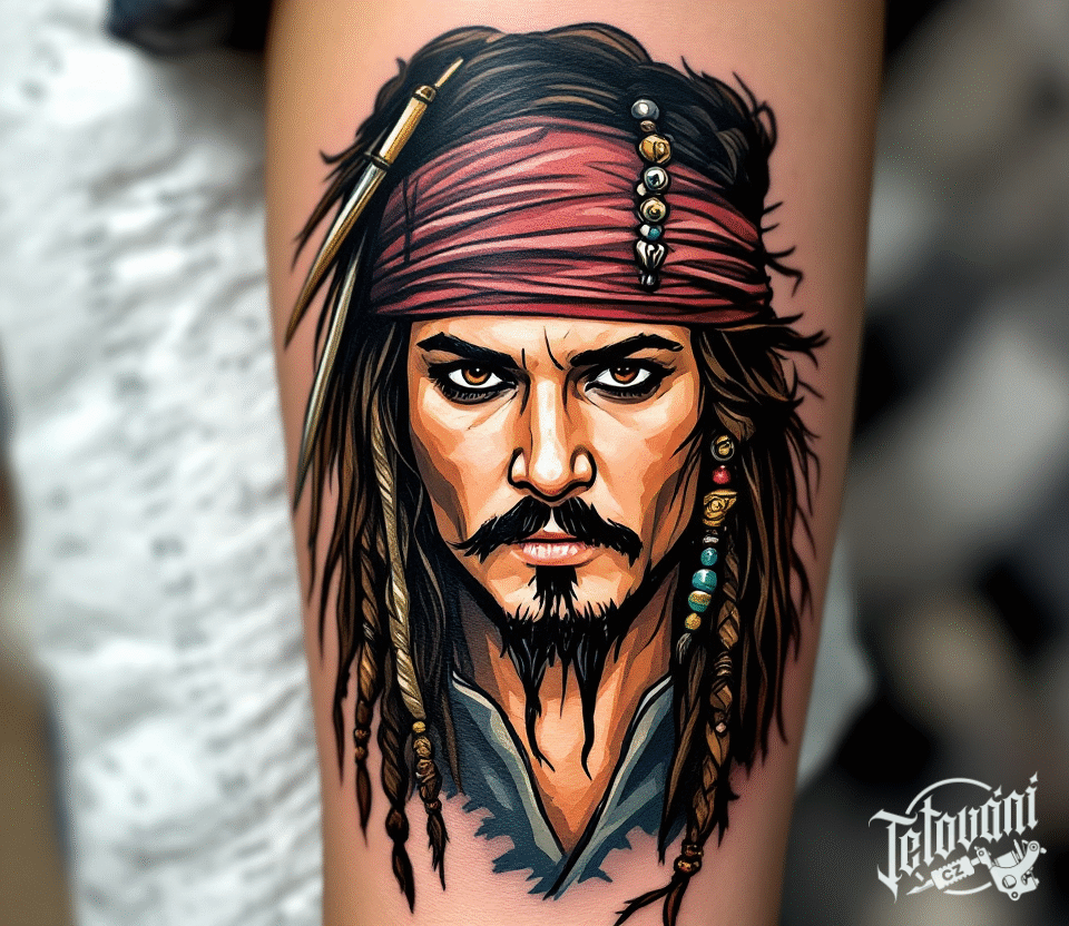 Tetování z filmů a pohádek, portrét, Jack Sparrow na lýtku