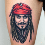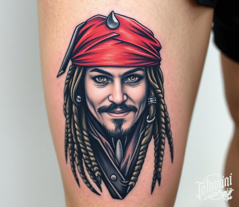 Tetování z filmů a pohádek, portrét, Jack Sparrow na stehně