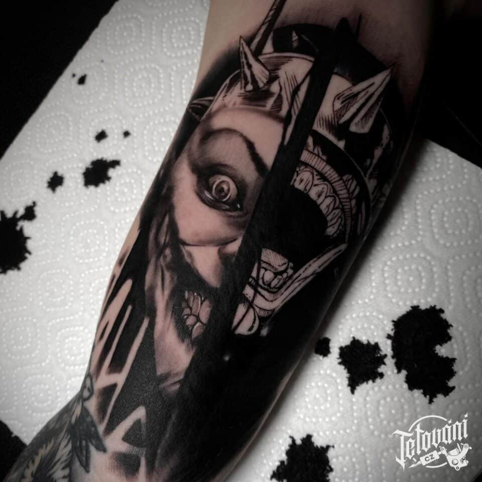 Tetování z filmů a pohádek, portrét Joker / Batman na paži