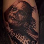 Tetování z filmů a pohádek, portrét Joker, nápisy na lýtko