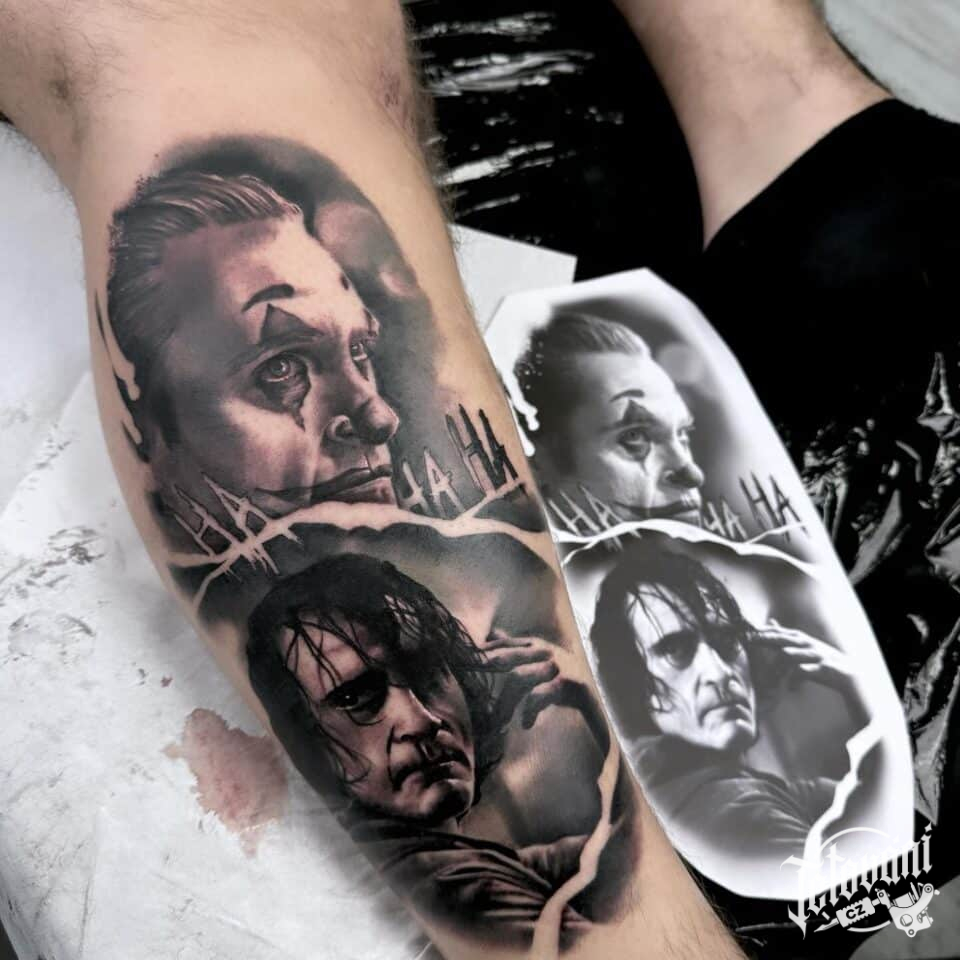 Tetování z filmů a pohádek portrét Jokera a písmena na lýtku