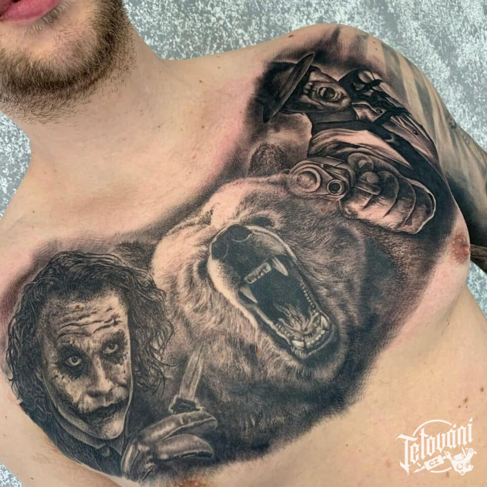 Tetování z filmů a pohádek, portrét Jokera, zvířata a medvěd na prsou