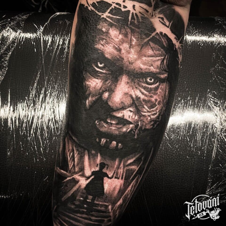 Tetování z filmů a pohádek, portrét muže s ostnatým dráte a dítě, symbol smrt na předloktí