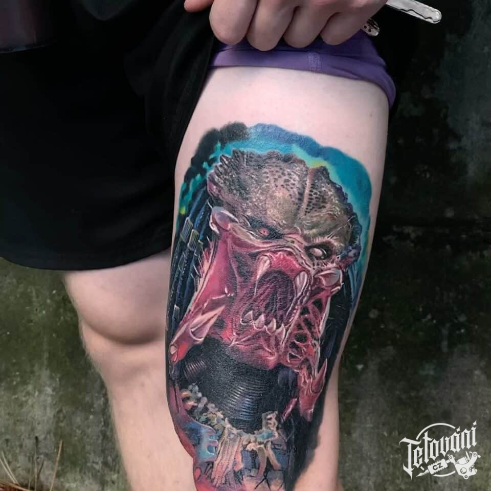 Tetování z filmů a pohádek, portrét predátora na stehnu