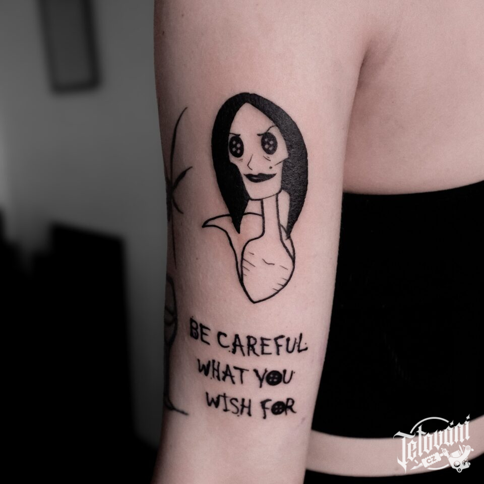 Tetování z filmů a pohádek, portrét s nápisy na paži