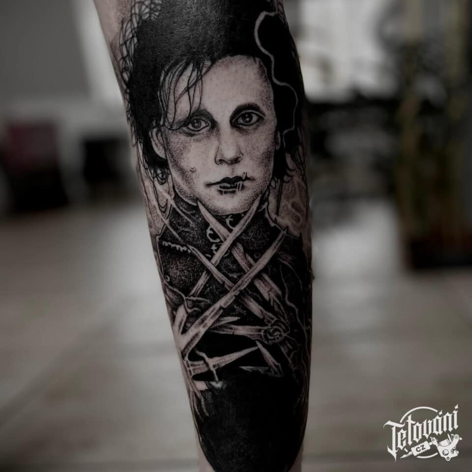 Tetování z filmů a pohádek, portrét Střihoruký Edward na lýtku