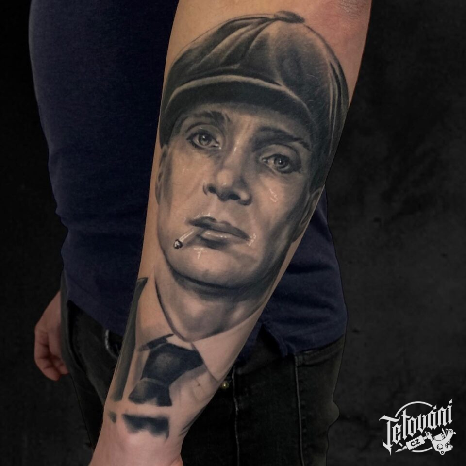 Tetování z filmů a pohádek, portrét z Peaky Blinders na předloktí