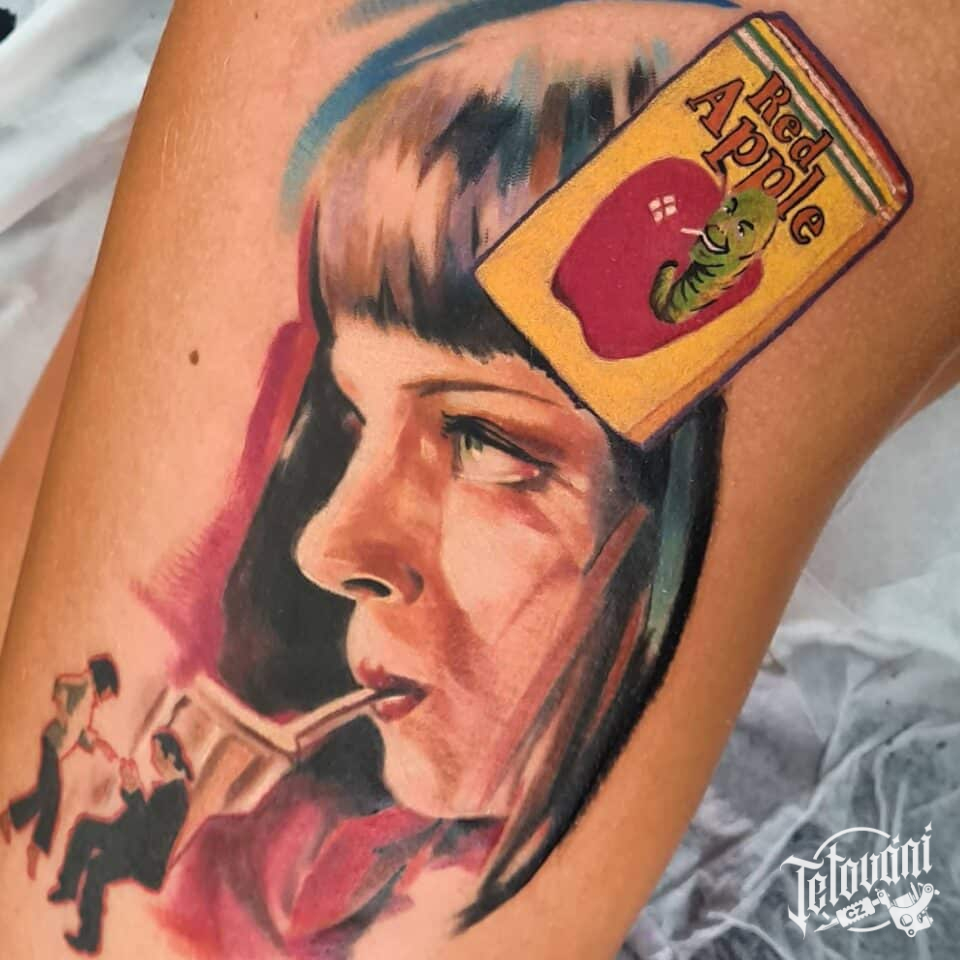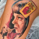 Tetování z filmů a pohádek, portrét, Uma Thurman na boku stehna