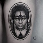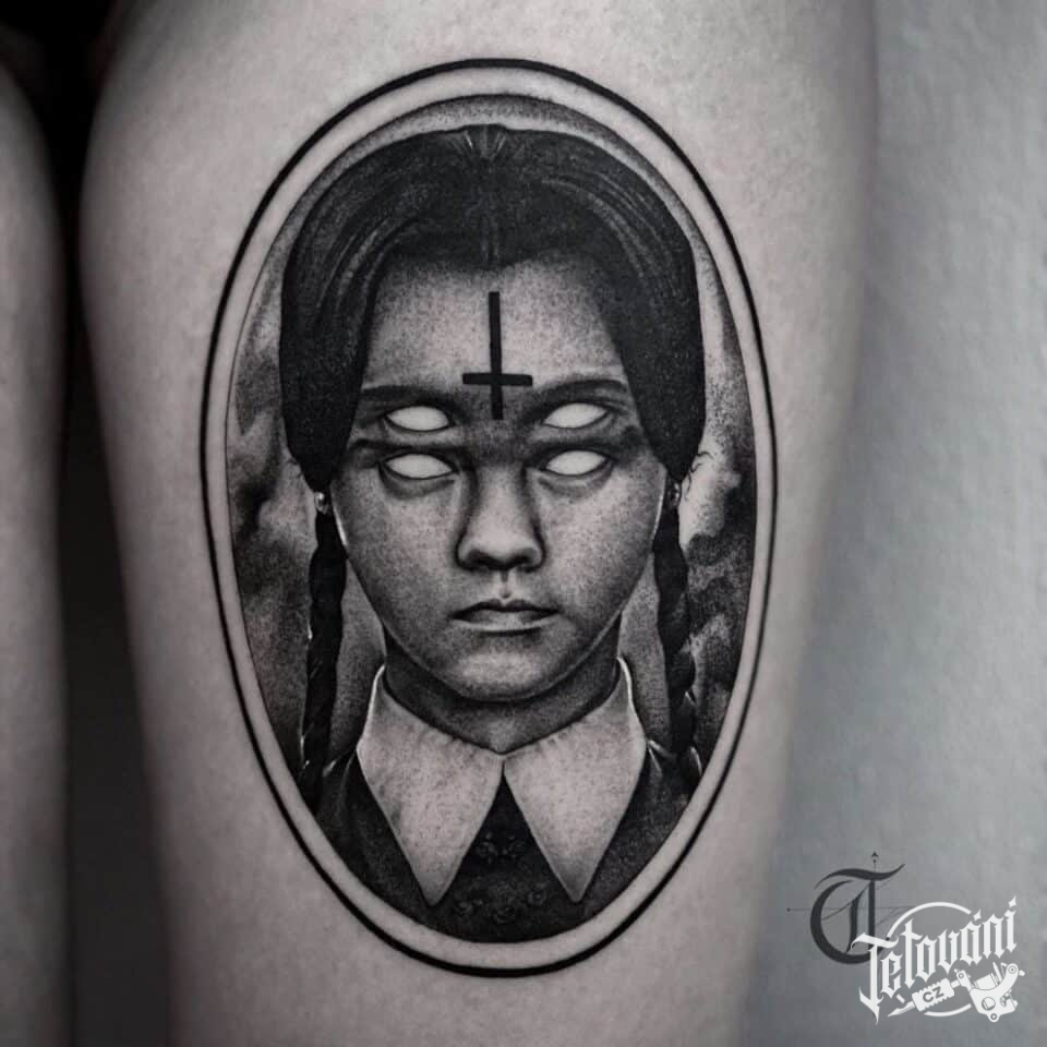 Tetování z filmů a pohádek, portrét Wednesday Addams na stehně