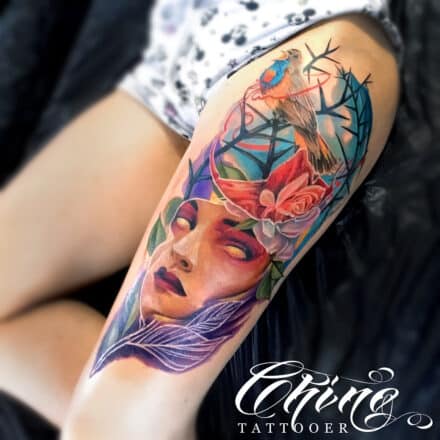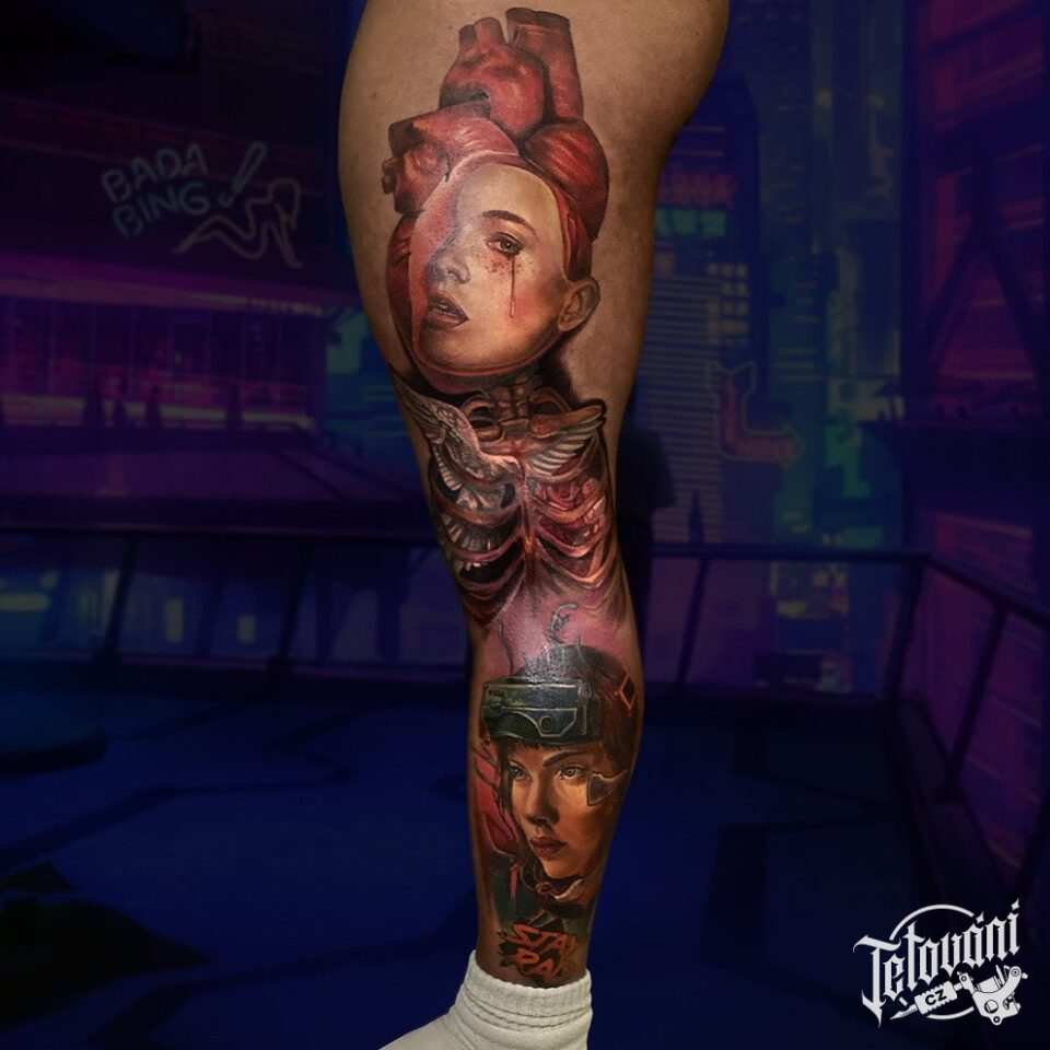 Tetování z filmů a pohádek, portrét, žena, srdce, zvířata, pták na noze