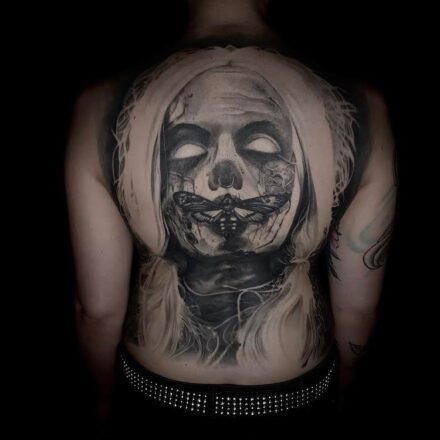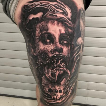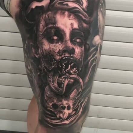 Tetování z filmů a pohádek, portrét ženy a znamení zla na stehnu