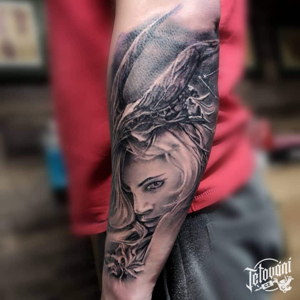 Tetování z filmů a pohádek, portrét ženy na předloktí