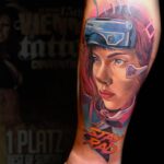 Tetování z filmů a pohádek, portrét ženy s nápis na lýtku