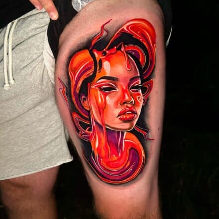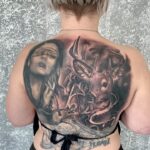 Tetování z filmů a pohádek, portrét ženy, symbol a zvíře, laň na zádech