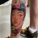 Tetování z filmů a pohádek Naruto, portrét ženy na lýtku