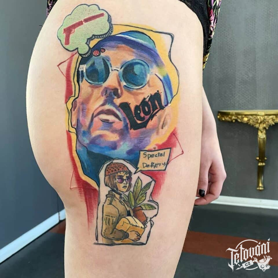 Tetování z filmů a pohádek, portréty z filmu Leon na boku stehna