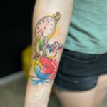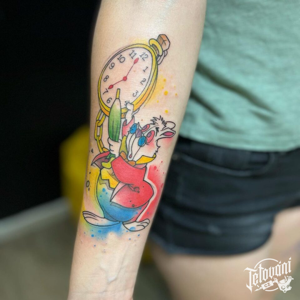 Tetování z filmů a pohádek, postavička a hodiny na předloktí