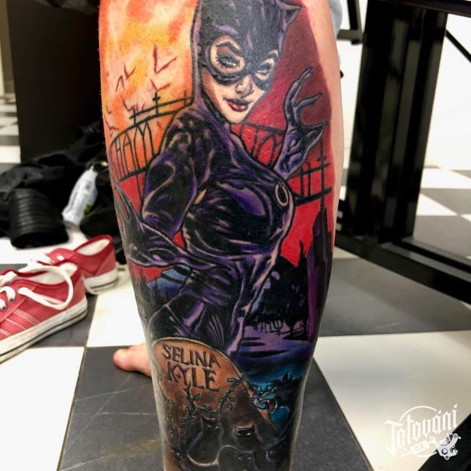 Tetování z filmů a pohádek, postavička Catwoman, nápisy na lýtko