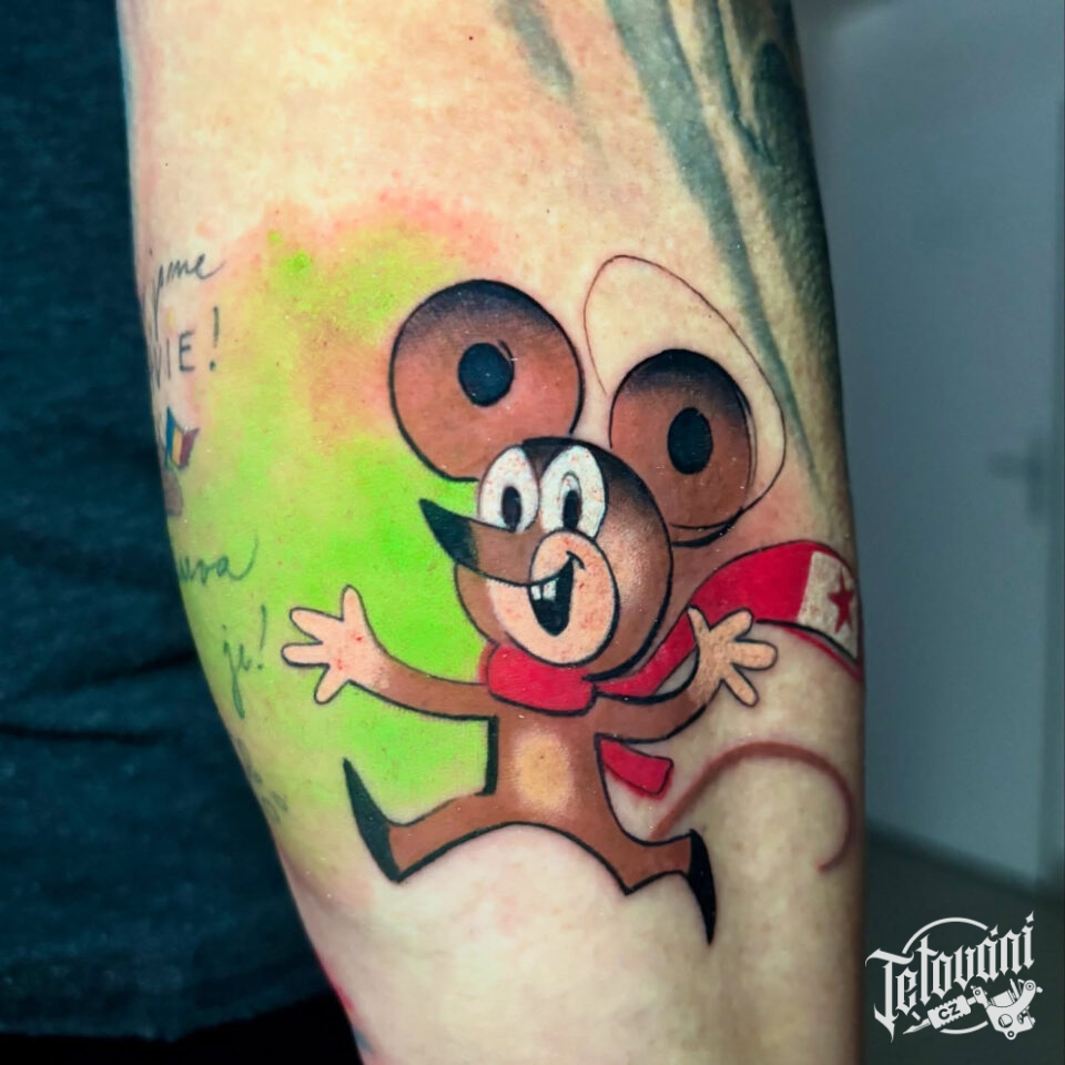 Tetování z filmů a pohádek, postavička myš z krtečka na předloktí
