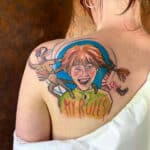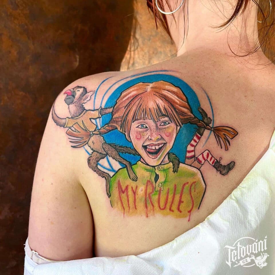Tetování z filmů a pohádek, postavičky a nápis na lopatce