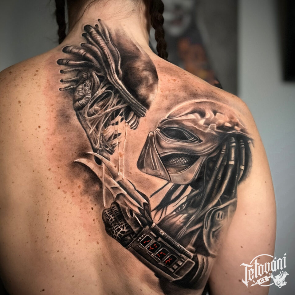 Tetování z filmů a pohádek predátor a vetřelec, nadpřirozená bytost na na záda