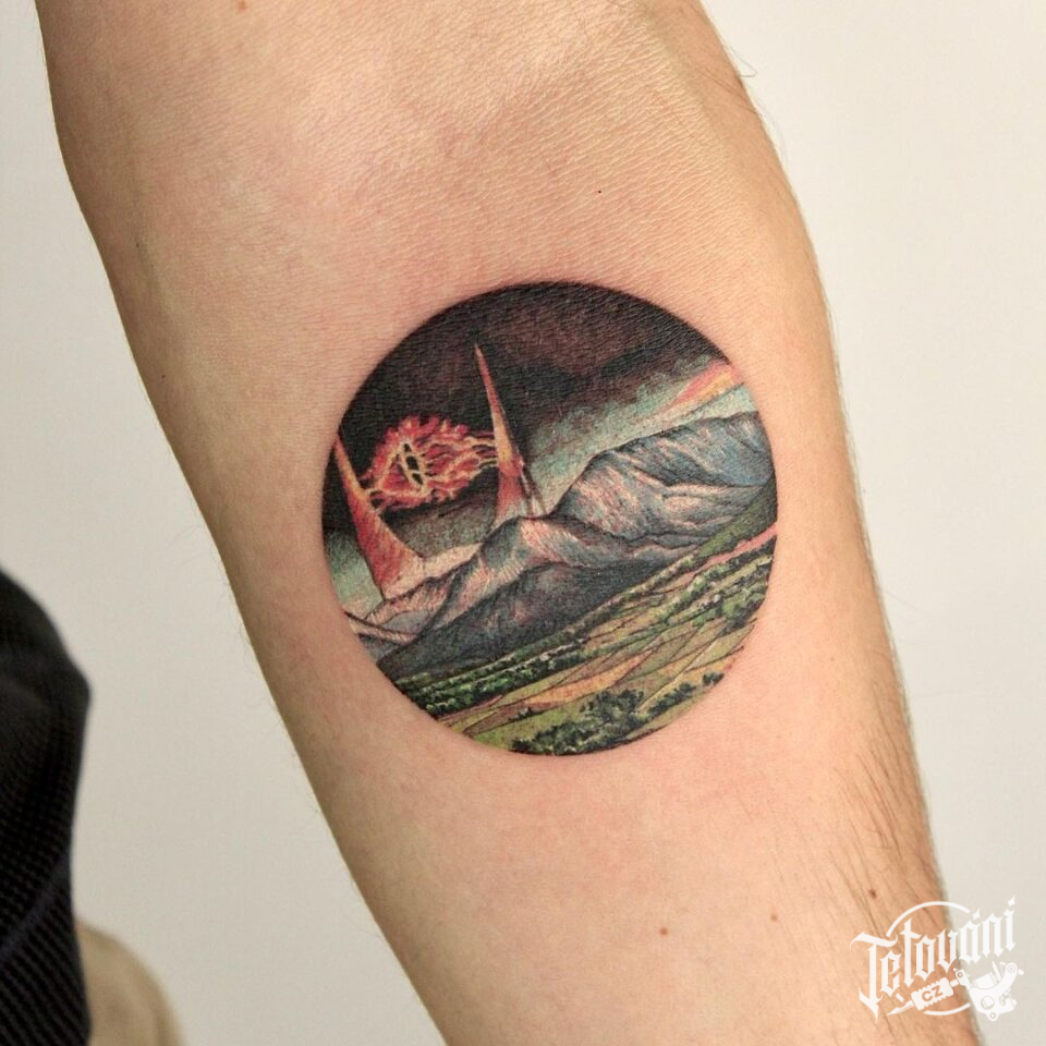 Tetování z filmů a pohádek, příroda, hory z Pána prstenů na předloktí