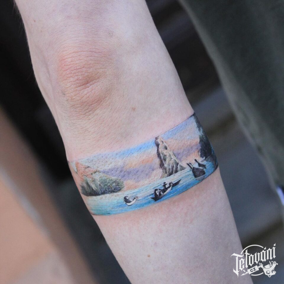 Tetování z filmů a pohádek, příroda z Pána prstenů na předloktí