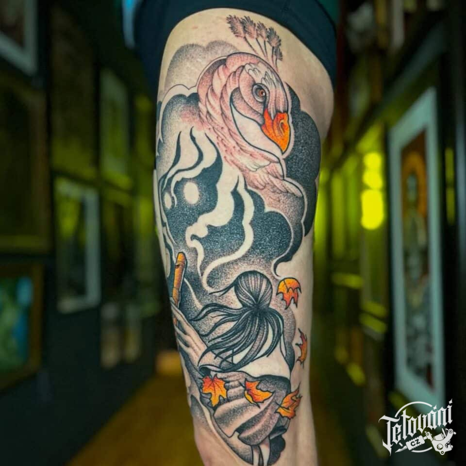 Tetování z filmů a pohádek, pták a žena na boku stehna