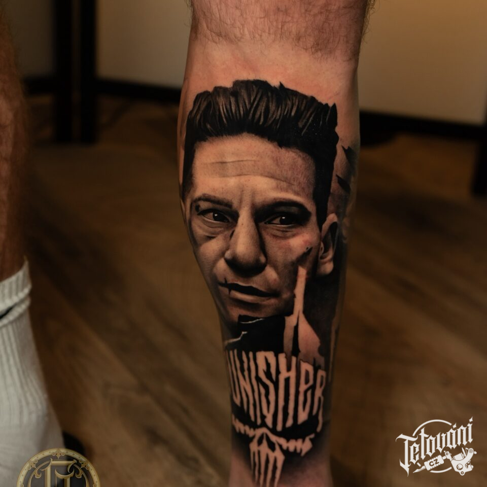 Tetování z filmů a pohádek Punisher, portrét na lýtko