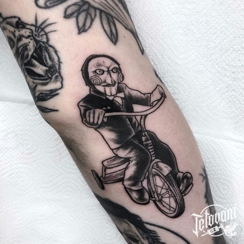 Tetování postavička z filmů a pohádek Saw na holeň