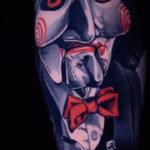 Tetování z filmů a pohádek, portrét ze Saw na lýtku