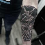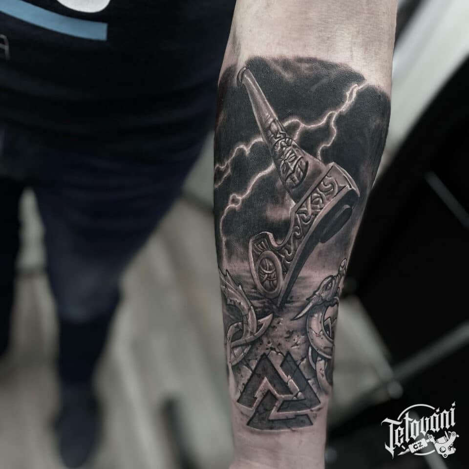 Tetování z filmů a pohádek Thorovo kladivo, znaky a symboly na předloktí