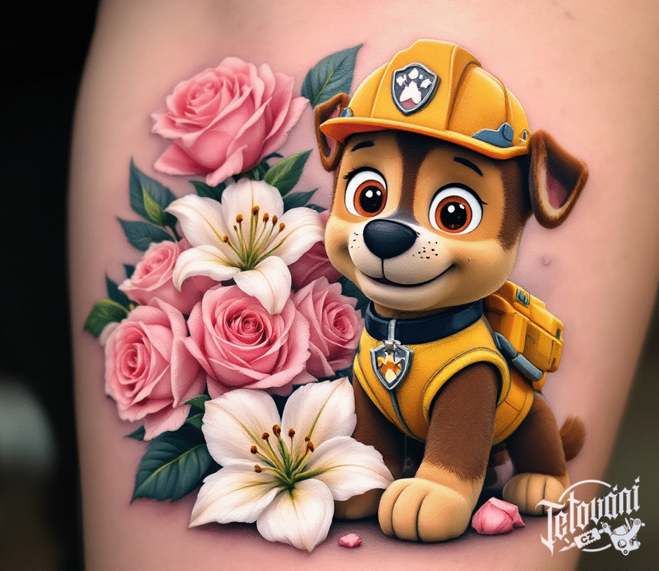Tetování z filmů a pohádek Tlapková patrola, postavička Rubl a květiny na lýtko
