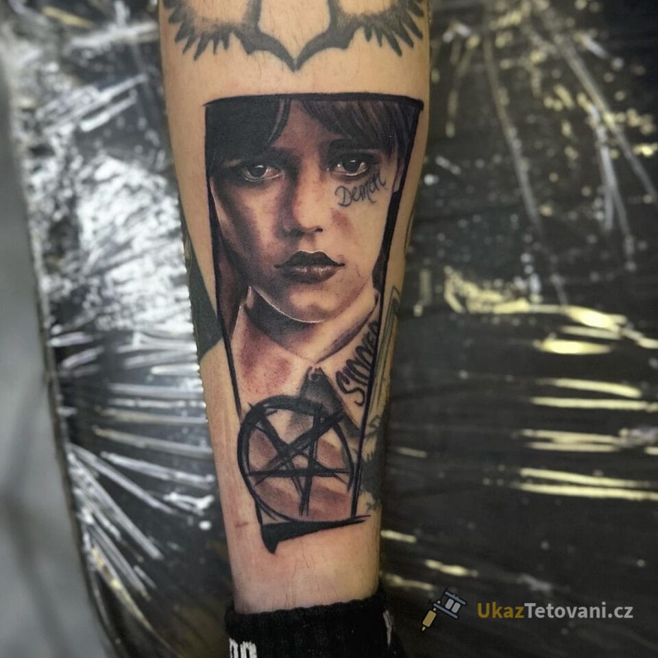 Tetování z filmů a pohádek Wednesday s pentagramem na lýtko