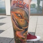 Tetování z filmů a pohádek, želva a nápis na lýtku