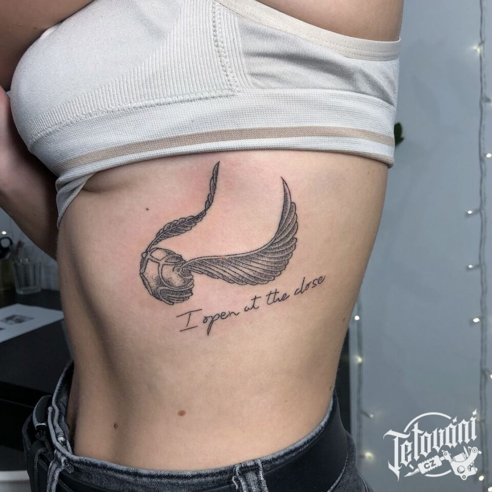 Tetování z filmů a pohádek zlatonka z Harryho Pottera na žebrech