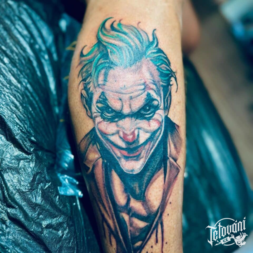 Tetování z filmů pohádek, portrét, Joker na lýtku