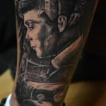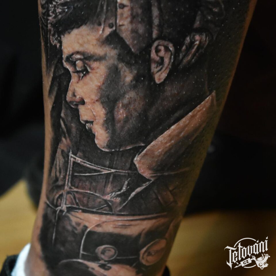 Tetování z filmů pohádek, portrét Tom Shelby na lýtku