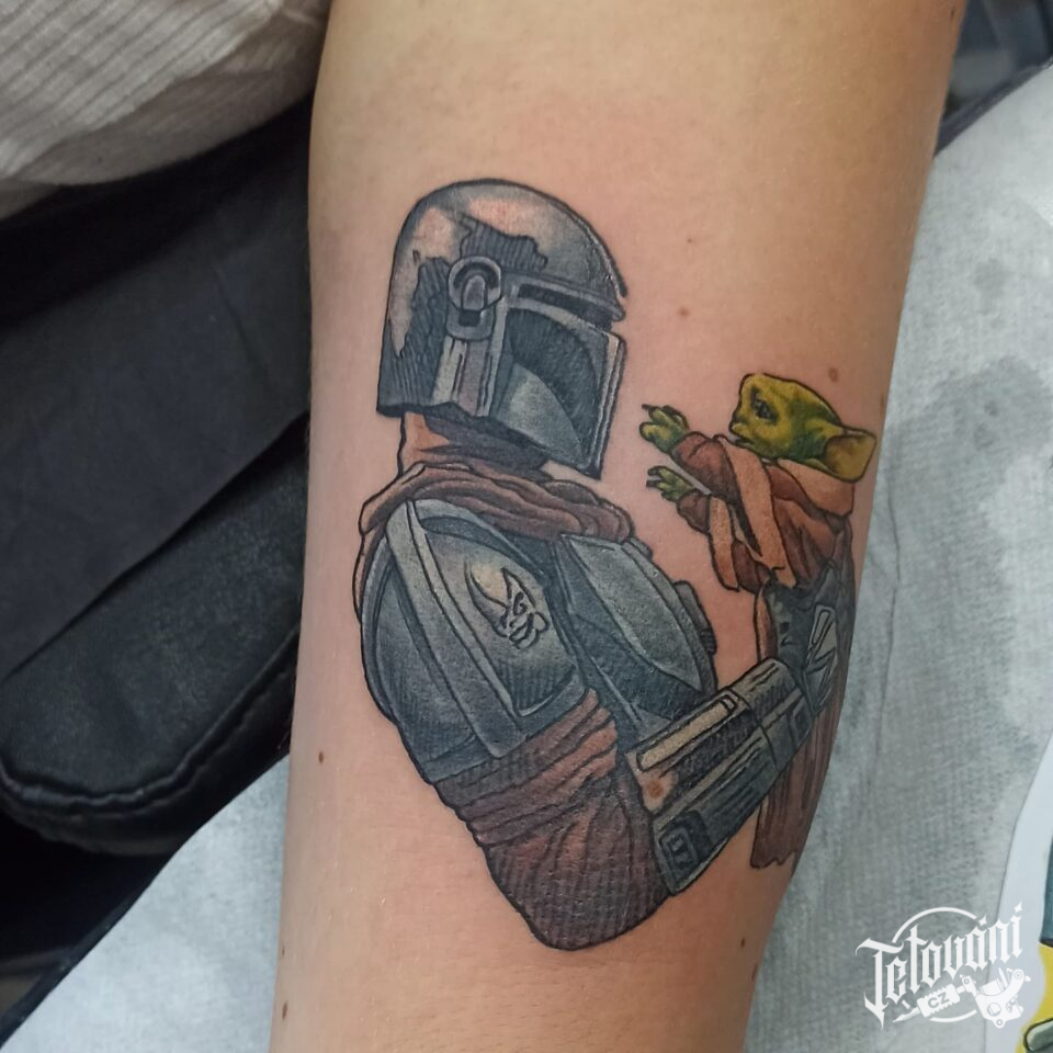 Tetování z filmů pohádek, rytíř a postavička na předloktí