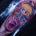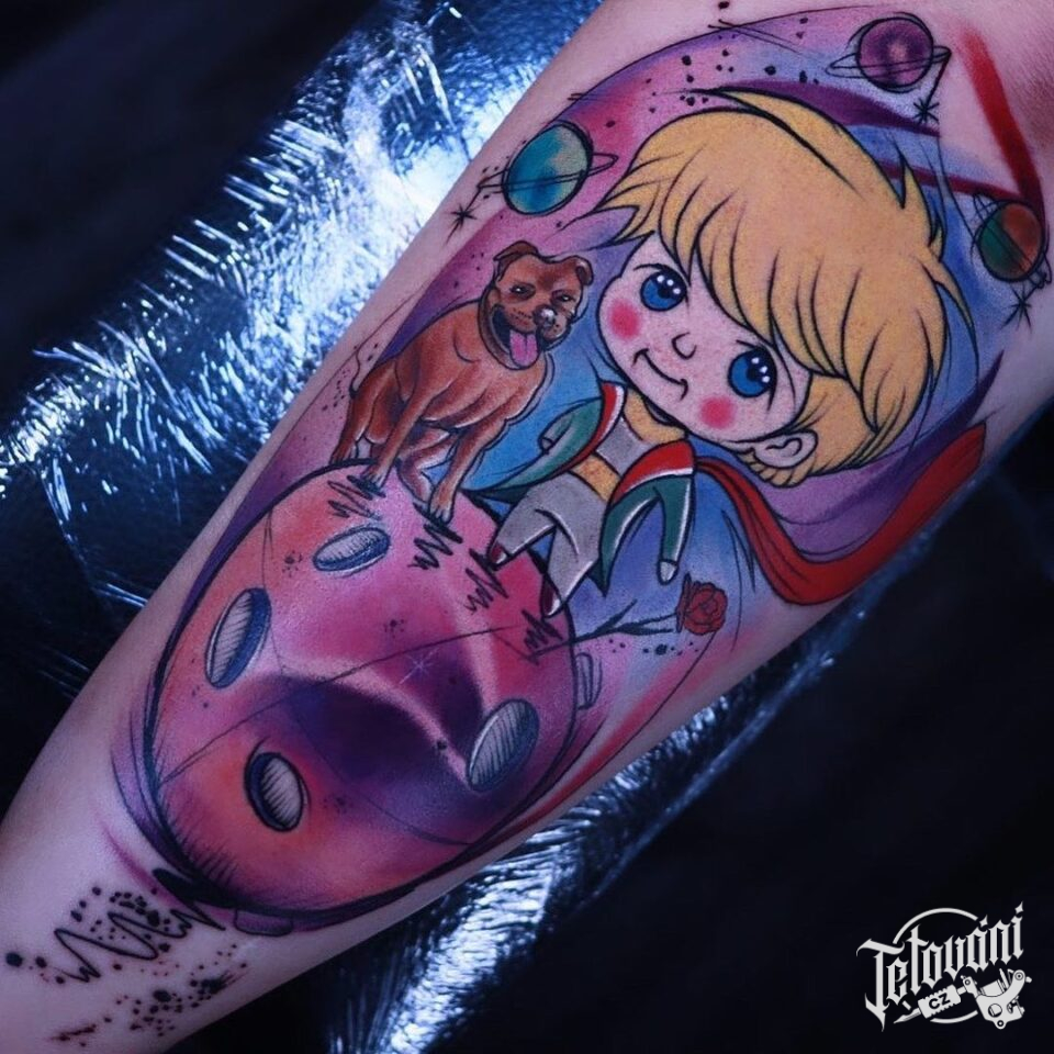 Tetování z pohádek, postavičky, pes, vesmír na lýtko