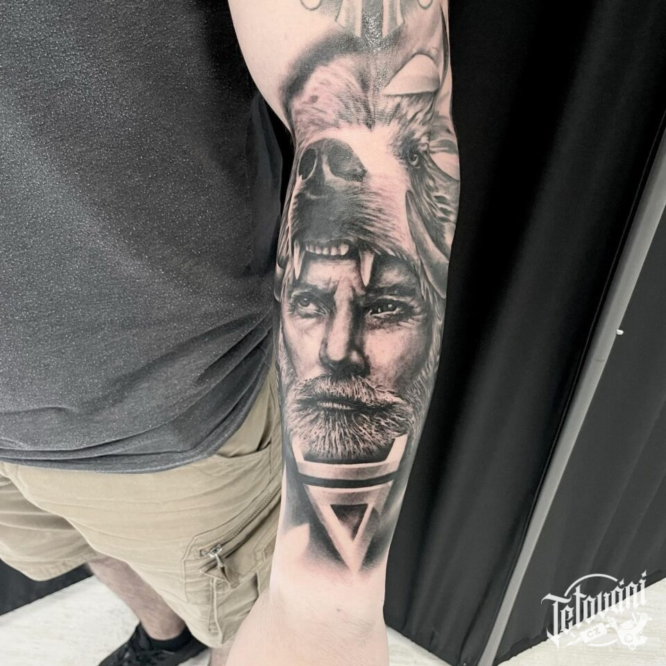 Tetování z portrét a zvíře, medvěd, znaky a symboly na předloktí