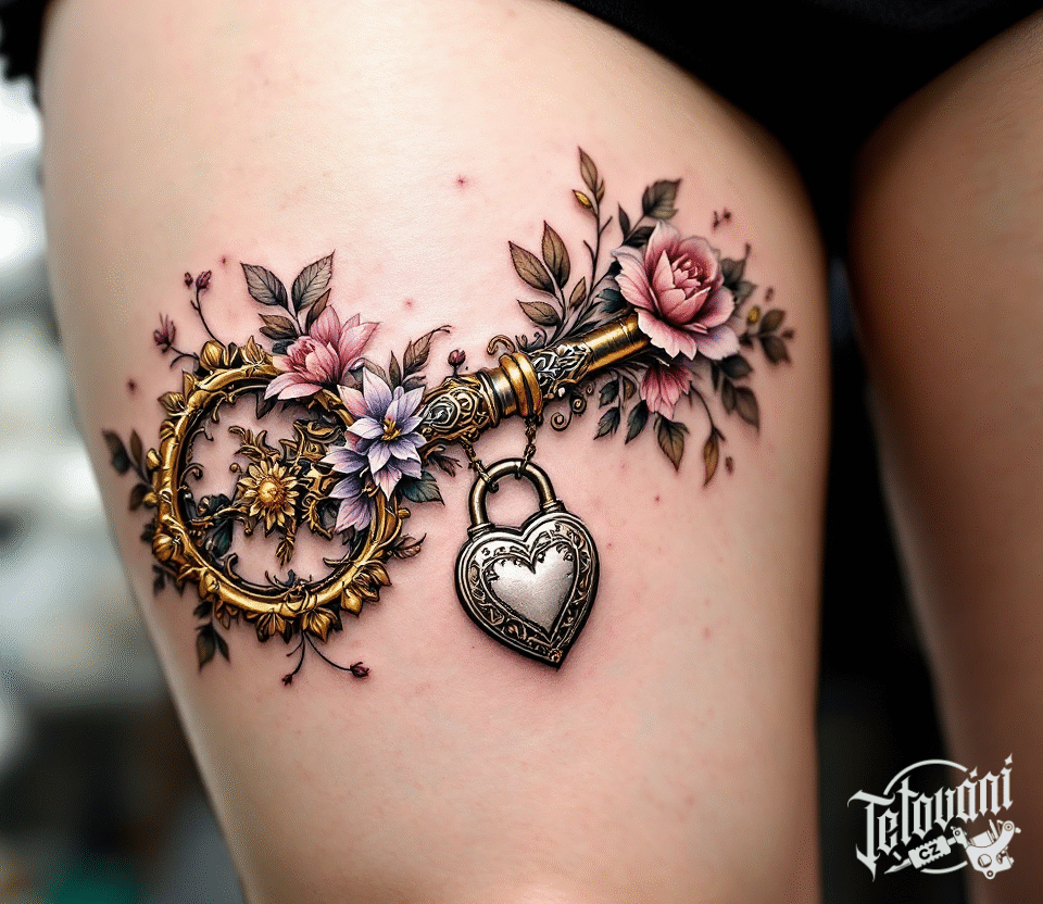 Tetování zámek s klíčem ozdobené květy na stehno